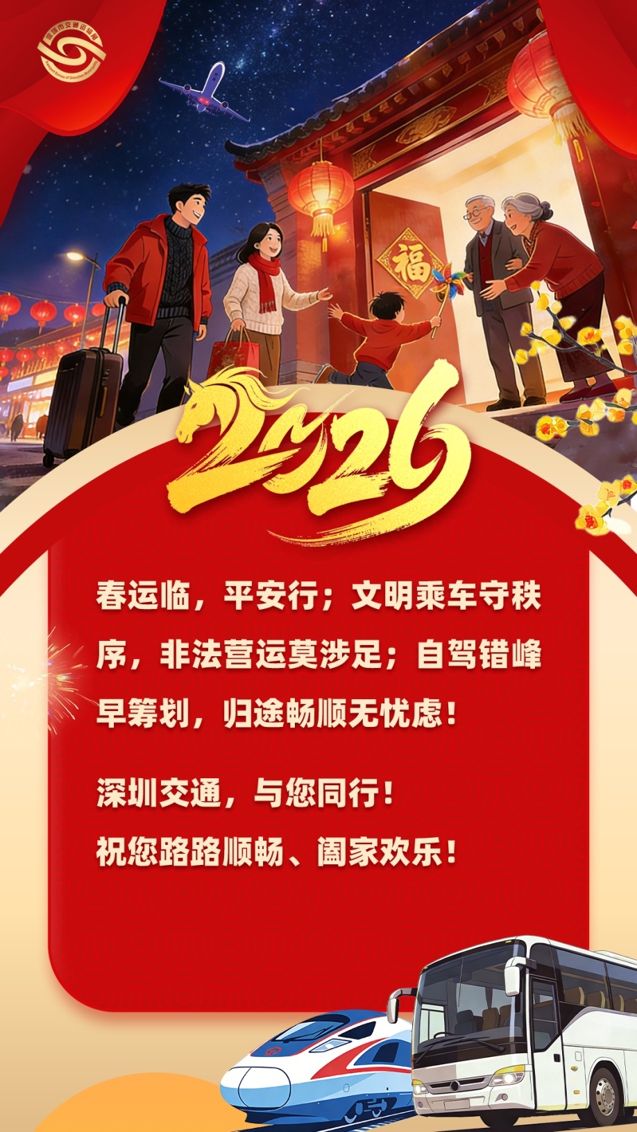 2026年春运时间较晚,我市总体气温偏高、降雨偏少,但仍可能经历4–5次冷空气过程,天气冷暖起伏明显。离深时段(2月2日—14日)粤北山区可能出现道路结冰或霜冻,对北上交通带来一定影响;返深时段(2月24日至3月14日)则可能出现阶段性阴雨天气,影响交通通行。