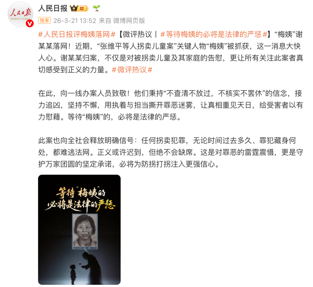 当天,人民日报微博发布微评“等待‘梅姨’的必将是法律的严惩”。全文如下: